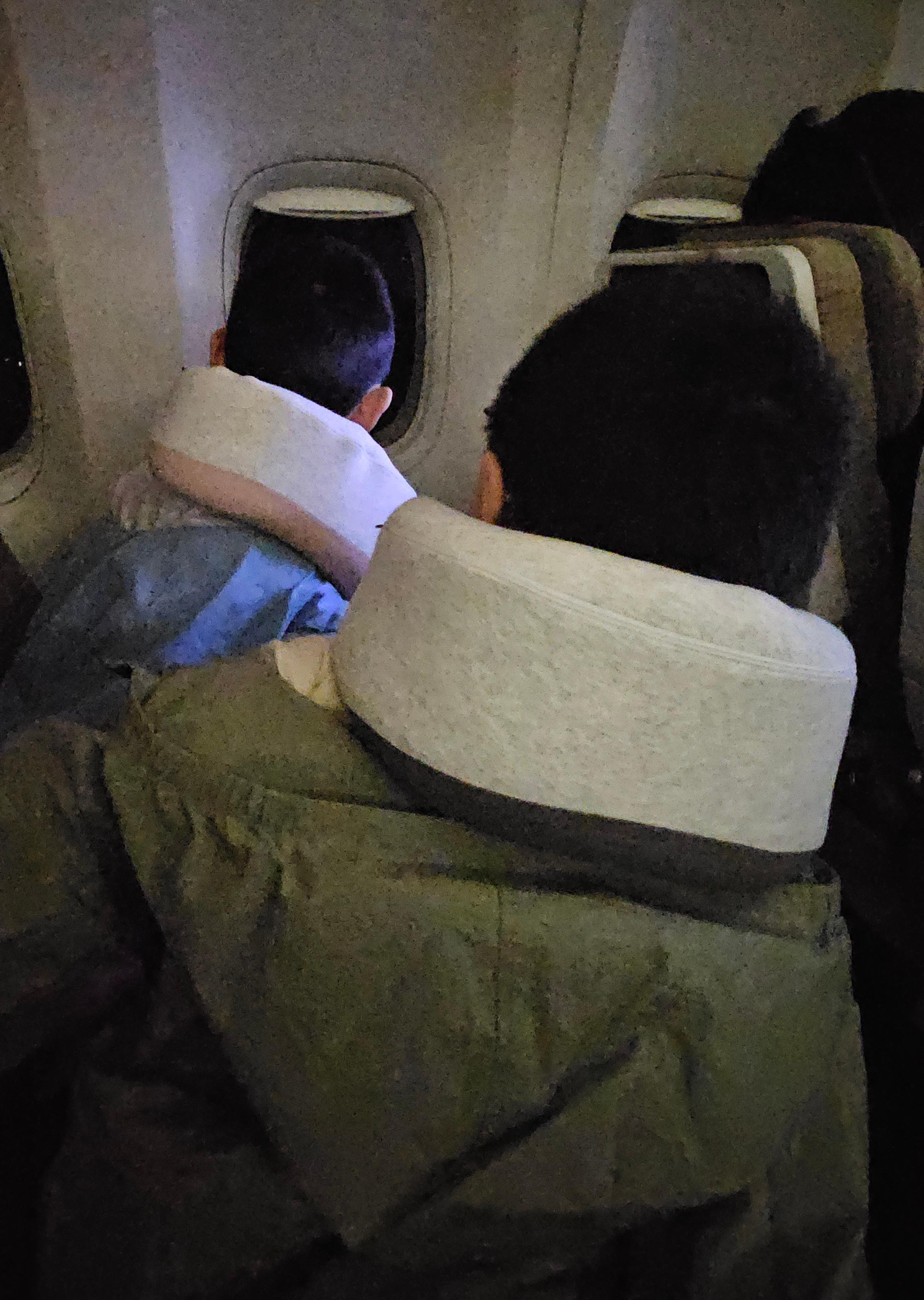 식사 후에는 조명이 어두워지고 대부분 승객들이 피곤해서 자는 분위기였습니다. 저도 저절로 잠이 들었는데 새우잠을 자서 피곤하긴했습니다. 아이들은 추천을 많이 받았던 기내 메모리폼 목베개를 베고 자서 그런지 잘 잤다고 하네요